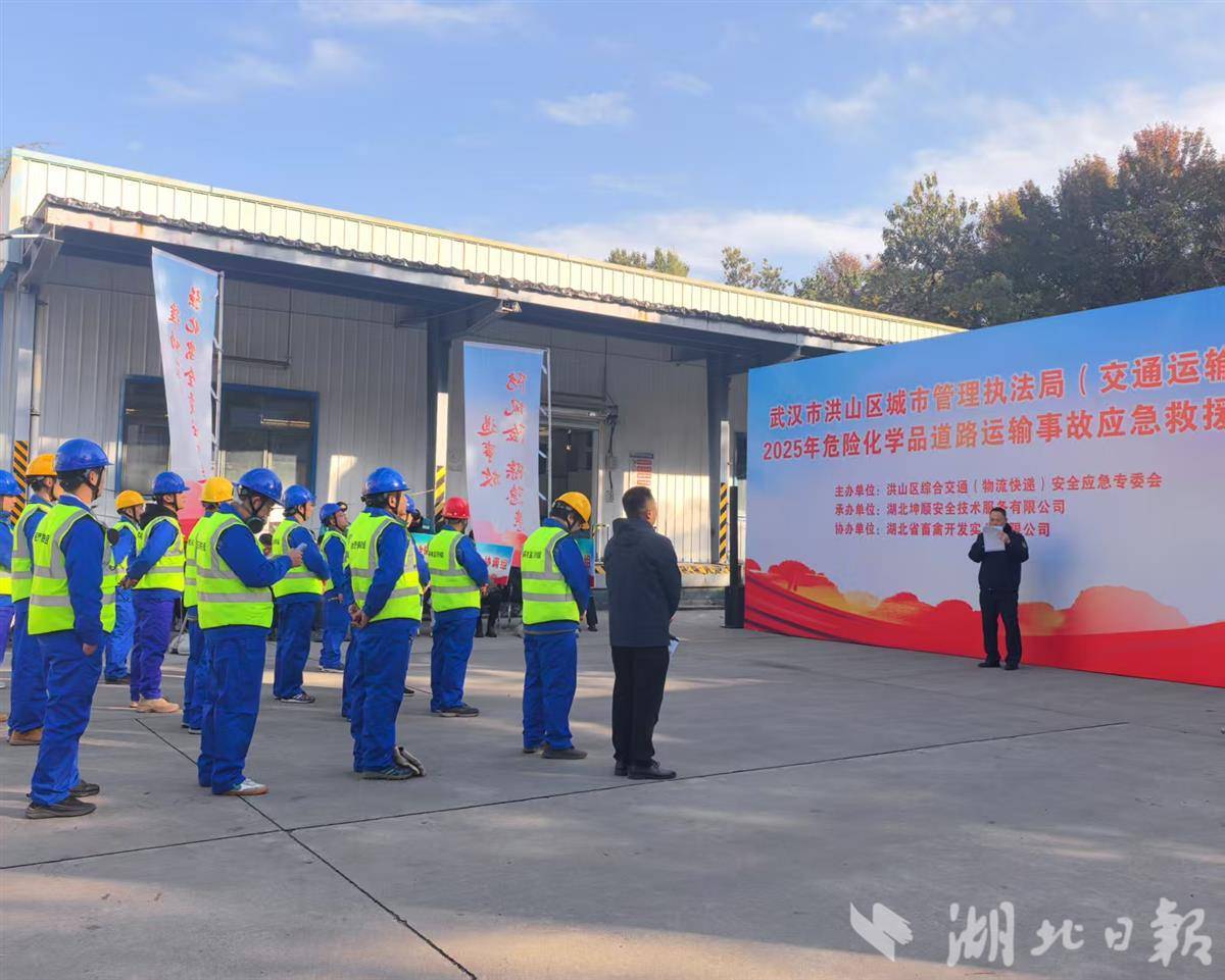 湖北日报讯(记者张景恒报道秦丹谢卓伟)“一辆卡车翻倒了一辆液氨罐车,罐体泄漏,现场冒出白烟,请立即寻求支援!” 11月18日下午3点,一场紧张有序的危险化学品道路运输事故应急救援演练在武汉市洪山区南湖大道畜禽养殖中心液氮配送站拉开帷幕。演练模拟了一辆装满液氨的罐车在行驶过程中被一辆卡车从后面追尾,导致后阀门破裂、液氨泄漏的突发危险。接到报告后,洪山区综合交通(物流、快递)应急安全委员会迅速启动应急响应,区城管执法局(交通局)成立现场指挥部。遵照现场指挥员的命令,警告人员疏散、应急堵漏、环境监测等工作有序进行。演练过程中,应急救援分队身穿专业防化服、佩戴空气呼吸器,迅速进入事故主现场,使用专业设备封堵泄漏点;安保小组在外围设立警戒区域,及时疏导交通,并组织模拟群众疏散;团队随后同时进行了事故调查和环境评估。整个过程指挥有力、反应迅速、配合密切,展现了协同作战和应急处置能力的大好戏。演练结束后,湖北省畜禽养殖中心液氮配送站负责人非常感动:“这次演练非常贴近工作实际,为我们积累了重要的应急处置经验”,提高了我们的应急处置能力。并增强人员面对危险时处理危险的信心,构建事后安全的预防和化学品安全的预防。洪山区城管执法局(交通运输局)相关负责人表示,此次演练是对应急处置、救援指挥协调、突发事件应急处置等方面的一次全面检验和实战训练,达到了训练内容、运行机制、提升能力的预期目标。洪山区40余家公路运输、物流快递企业前来观摩。