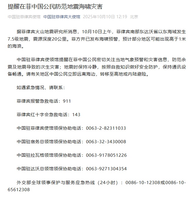 央视新闻:据菲律宾火山地震研究所消息,10月10日上午,菲律宾南部达沃东方省东海发生7.5级地震,震源深度20公里。菲律宾也发布海啸警报,预计部分地区可能出现超过1米的海浪。中国驻菲律宾使领馆提醒在菲华人同胞关注当地天气预警和灾害信息,防范地震引发余震和次生灾害;地震发生时保持冷静,根据自知情况采取安全防范措施,保持通讯设备畅通。请相关地区中国公民立即远离海域,转移至高地或陆地避难。如遇紧急情况,请联系: 菲律宾警察紧急热线:911 菲律宾红十字会紧急热线:143 领事协助中国驻菲律宾使馆咨询热线:0063-2-82311033 驻宿务总领馆领事热线:0063-32-3430008 驻佬沃领事热线:0063-9178051226 驻达沃总领馆领事协助热线:0063-9271304354全球领事保护与服务 外交部紧急热线(24小时):0086-10-12308或0086-10-65612308