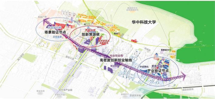 华华科技大学创新发展带示意图。 。校园对面、珞喻路南侧,从武汉光谷广场到关东产业园,将建设一条约4公里长的“华中科技大学创新发展带”,打造世界科创区。 11月15日,在华中科技大学第十七届企业家(武汉)大会上,武汉东湖高新区向全球华中科技校友推介“华科创新发展带”建设规划。根据规划,创新开发区规划范围为珞喻路、关东园路、雄楚大道、民族大道围成的区域,规划面积4.2平方公里。这将构建“一个核心、两点、一条线”的创新功能格局。所谓“一个核心”,就是要发展华科大学正门对面的汽车社区成为重要的创新策源地,致力于华科大学校友企业总部、创新孵化中心、企业服务中心等科创载体建设。将聚集华科大学、研发企业总部、高成长科技公司、领先创投机构等高能创新平台,重点配置国际青年公寓、国际交流中心等功能设施,为国际化人才创新创业营造友好环境,打造关山大道科技地标。 “两点支撑”即分别围绕关东工业园区和光谷步行街建设产业验证节点和场景验证节点。关东产业园将建设校地联合试点t 尺度变换簇。采取以维护、改造为主、新建为辅的策略。加快老厂房改造,建设校内中试基地、小型中试工厂、共享工厂、瞪羚加速器等产业载体,引进先进研究院、光电产品制造检测等研发转化功能平台。光谷步行街将在城市景观中打造未来试验场,引进美丽人形机器人销售等新型商业载体,配备智能展示中心、AI数字艺术装置、场景实验室、场景变换中心等技术。发展AR导航、无人机智能配送、车联网互动示范站、智能机器人导购、无人驾驶摆渡车等标杆示范应用场景支持新技术、新产品在场景验证应用中的应用。 “一条线连接”就是围绕光谷创业街打造“高密度创新创业轴”,加快东湖新技术创业中心、孵化器博物馆等转型升级,设立仿人机器人试点中心等个性中心,释放高品质、低价格的创业空间。我国首家企业孵化器——武汉东湖创业服务中心诞生于1987年,位于光谷创业街。届时,星光大道将在这里升级改造,打造创新重塑地标,凸显全国首个创业孵化器的标志性文化符号。 “华泰创新发展带”将重点推动华泰原创科技就近孵化推进“从0到1”,完善科技成果“技术研发-中试成熟-共享生产”的创新链,开通链接大学实验室和生产线的“20分钟变革通道”。东湖高新区将总体规划建设50亿元的关山大道环华科技创新发展带科技创新母子基金群,通过“母基金+子基金+直投”的模式,推动创新发展模式内的科技成果转化项目和科技初创企业股权投资。创新发展带按照“改造一批、利用一批、建设新一批”的原则,分批推进关东工业园、光谷步行街、光谷创业街改造项目,在全市率先推进推进高新大厦、流窗园区、东湖新技术创业中心等重点地点改造升级。规划建议,到2028年,建成10个创新功能平台,聚集500家高成长科技企业,10万以上科技创新人才,形成世界一流科技创新的基本框架。