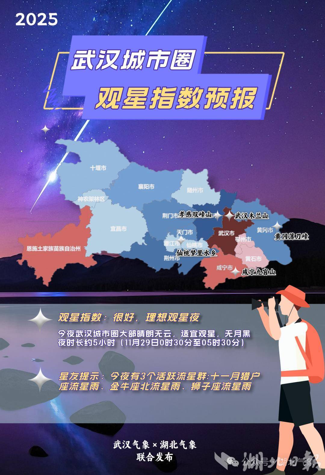 湖北日报讯(记者曾莉)本周两波弱冷空气先后影响湖北。虽然带来了强风,但气温并没有下降多少。目前,全省受高空西北气流控制,保持晴干燥局面。 11月份多地相对湿度创历史同期新低,部分地区森林火险等级处于高风险。据监测,11月27日13:00至14:00,罗田、营山相对湿度均小于9%,其中罗田打破当地11月最低纪录。 28日15时00分,全省大部分地区气温升至17℃至23℃。当天,武汉气温上升尤为显着。 7:00时气温仅为3.6℃,15:00时升至20.7℃,气温增幅超过17℃。气象部门预计,29日至30日,鄂东、鄂西部分地区气象森林等级较高,黄冈北部、咸宁南部等地进入高危状态。相关部门提醒公众,严格注意用火、用电安全,切勿带火进入林区,防止森林火灾。预计周末全省天气仍以晴到多云为主,非常适合秋季户外活动。但昼夜温差较大,需及时增减衣物。 28日夜间至29日上午,全省局地有大雾。公众应关注最新预警和预报信息。受周日新一波弱冷空气影响,全省将有阵风4~6级偏北风,气温小幅下降。 28日晚,武汉市区大部地区持续无月之夜。约5小时(29日0:30至5:30)。共有三个活跃的流星群,即十一月猎户座流星雨、北金牛座流星雨和狮子座流星雨。