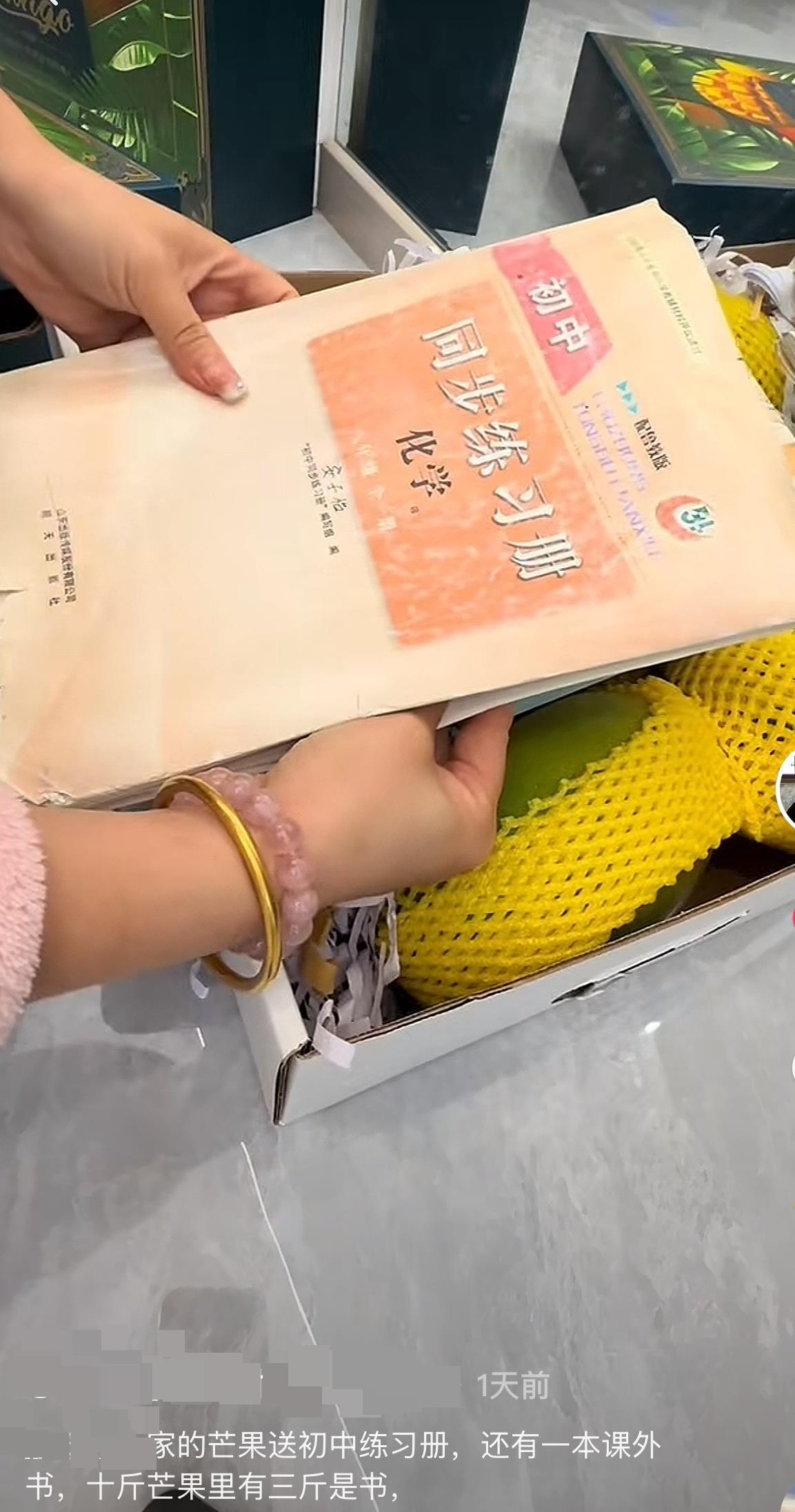 山东省济宁市的一位商贩,有一个芒果礼盒,里面装有“五年中考+三年模拟”试卷和语文教材。商家表示不知道,但可以退款但没有退货。